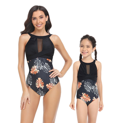 <HALTER FLORAL TRANSPARENT ONE-PIECE MOMMY AND ME SWIMSUIT>