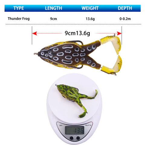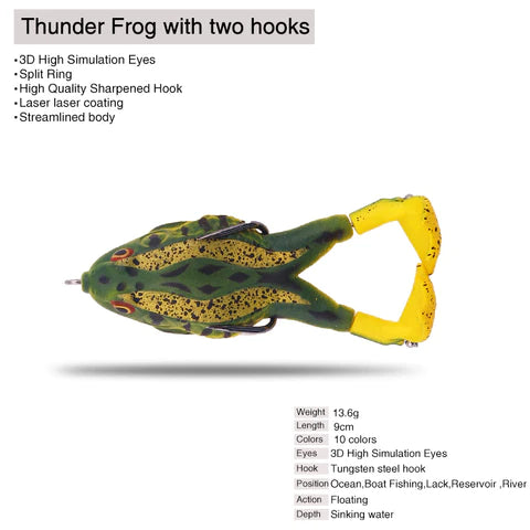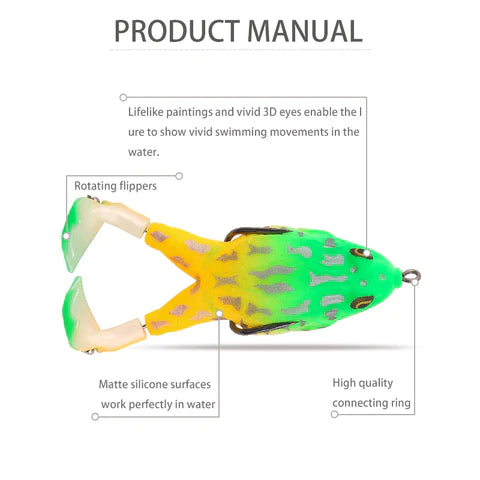 The high-resolution body details, life-like swimming action and Realistic 3D eyes perfectly replicate the real frog or bullfrog, bringing surf fishing performance and helping the angler capture greater harvest. Suitable for freshwater and saltwater. The frog fishing kit is an important addition to any tackle box.
