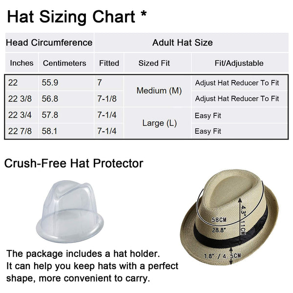 The size is 11 x 9.1 x 4.3 inches which can fit the head size 7,7-1/8,7-1/4. which between 22 and 22-7/8 inches, if your head size is average, you can wear it easily. Not waterproof, don't wash. There is a hat holder within the package. You can keep hats with a perfect shape with the holder. Please feel free to contact us if you have any question.